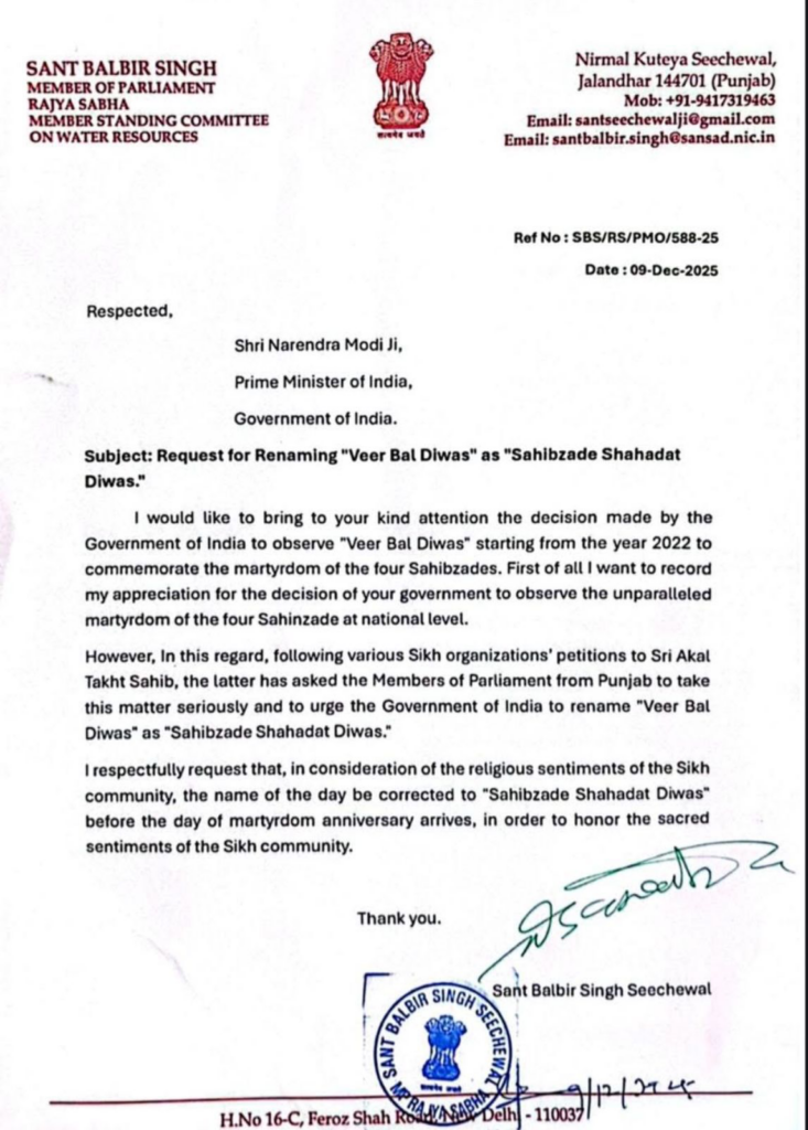 ਪੰਜਾਬ ਦੇ ਮੁੱਖ ਮੰਤਰੀ ਭਗਵੰਤ ਮਾਨ ਦੀ ਸਰਕਾਰ ਨੇ ਇੱਕ ਵਾਰ ਫਿਰ ਕੇਂਦਰ ਦੀ ਭਾਜਪਾ ਸਰਕਾਰ ਦੀ ਆਲੋਚਨਾ ਕੀਤੀ ਹੈ। ਸੰਸਦ ਮੈਂਬਰ ਸੰਤ ਬਲਬੀਰ ਸਿੰਘ ਸੀਚੇਵਾਲ ਨੇ ਪ੍ਰਧਾਨ ਮੰਤਰੀ ਨਰਿੰਦਰ ਮੋਦੀ ਨੂੰ ਇੱਕ ਪੱਤਰ ਲਿਖ ਕੇ ਮੰਗ ਕੀਤੀ ਹੈ ਕਿ ‘ਵੀਰ ਬਾਲ ਦਿਵਸ’ ਦਾ ਨਾਮ ਬਦਲ ਕੇ ‘ਸਾਹਿਬਜ਼ਾਦੇ ਸ਼ਹਾਦਤ ਦਿਵਸ’ ਰੱਖਿਆ ਜਾਵੇ। ਪੰਜਾਬ ਸਰਕਾਰ ਦਾ ਕਹਿਣਾ ਹੈ ਕਿ ਕੇਂਦਰ ਸਰਕਾਰ ਸਿੱਖ ਭਾਈਚਾਰੇ ਦੀਆਂ ਧਾਰਮਿਕ ਭਾਵਨਾਵਾਂ ਨੂੰ ਨਜ਼ਰਅੰਦਾਜ਼ ਕਰ ਰਹੀ ਹੈ ਅਤੇ ਪੰਜਾਬ ਦੇ ਗੌਰਵਮਈ ਇਤਿਹਾਸ ਨੂੰ ਬਣਦਾ ਸਤਿਕਾਰ ਨਹੀਂ ਦੇ ਰਹੀ ਹੈ। ਇਹ ਮੁੱਦਾ ਇੱਕ ਵਾਰ ਫਿਰ ਸਾਬਤ ਕਰਦਾ ਹੈ ਕਿ ਆਮ ਆਦਮੀ ਪਾਰਟੀ ਦੀ ਸਰਕਾਰ ਪੰਜਾਬ ਦੀ ਪਛਾਣ ਅਤੇ ਸਿੱਖ ਧਰਮ ਦੇ ਸਨਮਾਨ ਲਈ ਹਰ ਮੋਰਚੇ ‘ਤੇ ਲੜਨ ਲਈ ਤਿਆਰ ਹੈ।