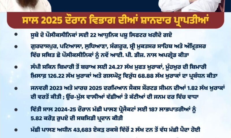 ਪੰਜਾਬ ਦੇ ਪਸ਼ੂ ਪਾਲਣ ਵਿਭਾਗ ਨੇ ਮੌਜੂਦਾ ਸਾਲ ਦੌਰਾਨ ਵੱਖ ਵੱਖ ਖੇਤਰਾਂ ਵਿੱਚ ਪ੍ਰਾਪਤੀਆਂ ਦਰਜ ਕਰਨ ਦੇ ਨਾਲ ਨਾਲ ਹੜ੍ਹਾਂ ਦੌਰਾਨ ਰਾਜ ਦੇ ਪਸ਼ੂਧਨ ਦੀ ਸੁਰੱਖਿਆ ਲਈ ਮਿਸਾਲੀ ਕੰਮ ਕੀਤੇ ਹਨ।