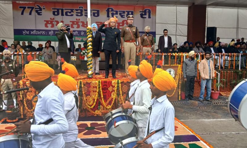 ਤਰਨ ਤਾਰਨ, 26 ਜਨਵਰੀ (            ) – ਦੇਸ਼ ਦਾ 77ਵਾਂ ਗਣਤੰਤਰ ਦਿਹਾੜਾ ਅੱਜ ਪੁਲਿਸ ਸਟੇਡੀਅਮ ਤਰਨ ਤਾਰਨ ਵਿਖੇ ਪੂਰੇ ਉਤਸ਼ਾਹ ਨਾਲ ਮਨਾਇਆ ਗਿਆ। ਇਸ ਜ਼ਿਲ੍ਹਾ ਪੱਧਰੀ ਗਣਤੰਤਰ ਦਿਵਸ ਸਮਾਗਮ ਦੌਰਾਨ ਡਿਪਟੀ ਕਮਿਸ਼ਨਰ ਤਰਨ ਤਾਰਨ ਸ੍ਰੀ ਰਾਹੁਲ, ਆਈ.ਏ.ਐੱਸ. ਵੱਲੋਂ ਕੌਮੀ ਝੰਡਾ ਲਹਿਰਾਉਣ ਦੀ ਰਸਮ ਅਦਾ ਕੀਤੀ।