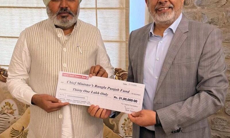 ਫੰਡ ਵਿੱਚ ਯੋਗਦਾਨ ਵਜੋਂ ਕੈਪੀਟਲ ਸਮਾਲ ਫਾਈਨਾਂਸ ਬੈਂਕ ਦੇ ਮੈਨੇਜਿੰਗ ਡਾਇਰੈਕਟਰ ਅਤੇ ਸੀ.ਈ.ਓ. ਸਰਵਜੀਤ ਸਿੰਘ ਸਮਰਾ ਵੱਲੋਂ 31 ਲੱਖ ਰੁਪਏ ਦਾ ਚੈੱਕ ਵਿੱਤ ਮੰਤਰੀ ਨੂੰ ਸੌਂਪਿਆ ਗਿਆ। ਵਿੱਤ ਮੰਤਰੀ ਹਰਪਾਲ ਸਿੰਘ ਚੀਮਾ ਨੇ ਬੈਂਕ ਵੱਲੋਂ ਖੁੱਲ੍ਹੇ ਦਿਲ ਨਾਲ ਫੰਡ ਵਿੱਚ ਯੋਗਦਾਨ ਦੇਣ ਦੇ ਉਪਰਾਲੇ ਅਤੇ ਸਮਾਜਿਕ ਜਵਾਬਦੇਹੀ ਪ੍ਰਤੀ ਅਦਾਰੇ ਦੀ ਵਚਨਬੱਧਤਾ ਦੀ ਸ਼ਲਾਘਾ ਕੀਤੀ।