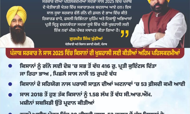 ਮੁੱਖ ਮੰਤਰੀ ਸ. ਭਗਵੰਤ ਸਿੰਘ ਮਾਨ ਦੀ ਅਗਵਾਈ ਵਾਲੀ ਪੰਜਾਬ ਸਰਕਾਰ ਦੀਆਂ ਪਹਿਲਕਦਮੀਆਂ ਸਦਕਾ ਸਾਲ 2025 ਵਿੱਚ ਪੰਜਾਬ ਦੇ ਖੇਤੀਬਾੜੀ ਖੇਤਰ ਵਿੱਚ ਸਕਾਰਾਤਮਕ ਬਦਲਾਅ ਆਏ ਹਨ। ਇਸ ਸਾਲ ਸੂਬਾ ਸਰਕਾਰ ਵੱਲੋਂ ਗੰਨੇ ਦੀ ਫ਼ਸਲ ਦੇ ਭਾਅ ਵਿੱਚ ਕੀਤੇ ਰਿਕਾਰਡ ਵਾਧੇ, ਫਸਲੀ ਵਿਭਿੰਨਤਾ ਮੁਹਿੰਮ ਅਤੇ ਟਿਕਾਊ ਅਭਿਆਸਾਂ ਪ੍ਰਤੀ ਦ੍ਰਿੜ੍ਹ ਵਚਨਬੱਧਤਾ ਸਦਕਾ ਸੂਬੇ ਵਿੱਚ ਖੇਤੀ ਖੁਸ਼ਹਾਲੀ ਲਈ ਇੱਕ ਨਵਾਂ ਮੀਲ ਪੱਥਰ ਸਥਾਪਤ ਕੀਤਾ ਗਿਆ ਹੈ।