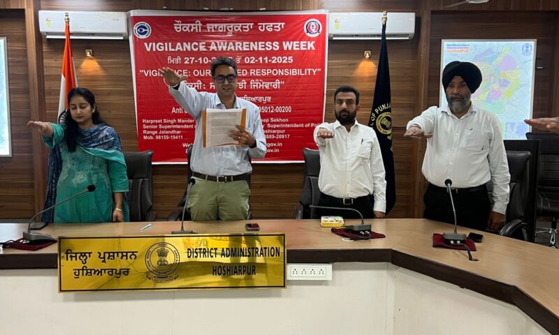 ਵਿਜੀਲੈਂਸ ਬਿਊਰੋ, ਯੂਨਿਟ ਹੁਸ਼ਿਆਰਪੁਰ ਵੱਲੋਂ ਮਨਾਏ ਜਾ ਰਹੇ ਵਿਜੀਲੈਂਸ ਜਾਗਰੂਕਤਾ ਸਪਤਾਹ ਤਹਿਤ ਜ਼ਿਲ੍ਹਾ ਪ੍ਰਬੰਧਕੀ ਕੰਪਲੈਕਸ ਵਿਖੇ ਡੀ.ਐਸ.ਪੀ ਵਿਜੀਲੈਂਸ ਮਨਦੀਪ ਸਿੰਘ ਸੇਖੋ ਵੱਲੋਂ ਸਰਕਾਰੀ ਅਧਿਕਾਰੀਆਂ ਅਤੇ ਕਰਮਚਾਰੀਆਂ ਨੂੰ ਇਮਾਨਦਾਰੀ ਨਾਲ ਡਿਊਟੀ ਨਿਭਾਉਣ ਲਈ ਸਹੁੰ ਚੁਕਾਈ ਗਈ। ਇਸ ਮੌਕੇ ਵਿਜੀਲੈਂਸ ਵਿਭਾਗ ਦੇ ਕਰਮਚਾਰੀਆਂ ਤੋਂ ਇਲਾਵਾ ਵੱਖ-ਵੱਖ ਵਿਭਾਗਾਂ ਦੇ ਅਧਿਕਾਰੀਆਂ ਅਤੇ ਕਰਮਚਾਰੀਆਂ ਨੇ ਭਾਗ ਲਿਆ।