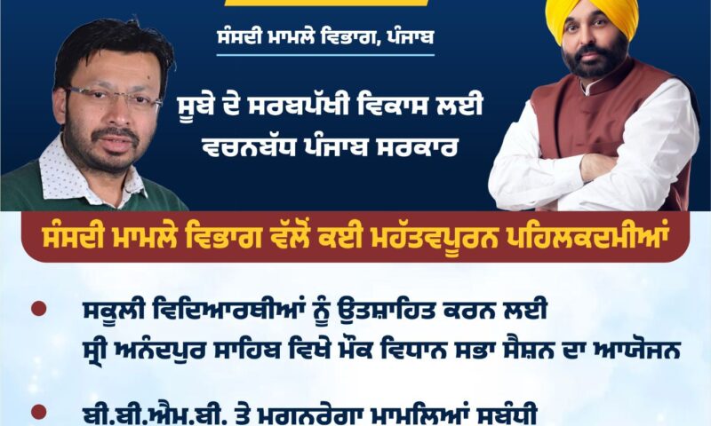 ਪੰਜਾਬ ਸਰਕਾਰ ਨੇ ਸੰਵਿਧਾਨ ਦਿਵਸ ਦੇ ਮੌਕੇ ‘ਤੇ ਸ੍ਰੀ ਅਨੰਦਪੁਰ ਸਾਹਿਬ ਵਿਖੇ ਸ੍ਰੀ ਗੁਰੂ ਤੇਗ਼ ਬਹਾਦਰ ਜੀ ਦੇ 350ਵੇਂ ਸ਼ਹੀਦੀ ਦਿਵਸ ਸਮਾਗਮਾਂ ਵਿਸ਼ੇਸ਼ ਤੌਰ ਤੇ ਤਿਆਰ ਕੀਤੀ ਗਈ ਪੰਜਾਬ ਵਿਧਾਨ ਸਭਾ ਵਿਚ ਪੰਜਾਬ ਦੇ ਸਰਕਾਰੀ ਸਕੂਲਾਂ ਦੇ ਵਿਦਿਆਰਥੀਆਂ ਨੂੰ ਮੌਕ ਵਿਧਾਨ ਸਭਾ ਸੈਸ਼ਨ ਕਰਵਾ ਕੇ ਉਤਸ਼ਾਹਿਤ ਕੀਤਾ ਗਿਆ, ਤਾਂ ਜੋ ਸੂਬੇ ਦੇ ਵਿਦਿਆਰਥੀ ਰਾਜਨੀਤੀ ‘ਚ ਸ਼ਮੂਲੀਅਤ ਕਰਨ ਅਤੇ ਭਵਿੱਖ ਦੇ ਨੇਤਾ ਬਣਨ ਦੇ ਯੋਗ ਬਣ ਸਕਣ।