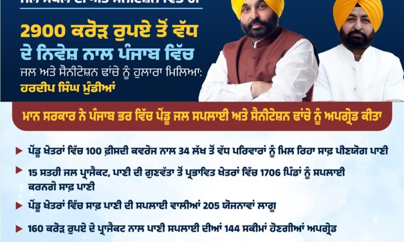 ਪੰਜਾਬ ਦੇ ਜਲ ਸਪਲਾਈ ਅਤੇ ਸੈਨੀਟੇਸ਼ਨ ਮੰਤਰੀ ਸ. ਹਰਦੀਪ ਸਿੰਘ ਮੁੰਡੀਆਂ ਨੇ ਦੱਸਿਆ ਕਿ ਮੁੱਖ ਮੰਤਰੀ ਸ. ਭਗਵੰਤ ਸਿੰਘ ਮਾਨ ਦੀ ਅਗਵਾਈ ਵਾਲੀ ਪੰਜਾਬ ਸਰਕਾਰ ਨੇ ਪੰਜਾਬ ਭਰ ਵਿੱਚ ਜਲ ਸਪਲਾਈ ਅਤੇ ਸੈਨੀਟੇਸ਼ਨ ਬੁਨਿਆਦੀ ਢਾਂਚੇ ਨੂੰ ਮਜ਼ਬੂਤੀ ਦੇਣ ਲਈ 2,900 ਕਰੋੜ ਰੁਪਏ ਤੋਂ ਵੱਧ ਦਾ ਨਿਵੇਸ਼ ਕੀਤਾ ਹੈ। ਉਨ੍ਹਾਂ ਕਿਹਾ ਕਿ ਇਸ ਵੱਡੇ ਨਿਵੇਸ਼ ਨਾਲ ਪ੍ਰਮੁੱਖ ਪ੍ਰਾਜੈਕਟਾਂ ਨੂੰ ਜਲਦ ਮੁਕੰਮਲ ਕਰਨ, ਨਵੀਨ ਤਕਨਾਲੋਜੀ ਦੇ ਵਿਸਥਾਰ ਅਤੇ ਪਾਣੀ ਦੀ ਗੁਣਵੱਤਾ ਅਤੇ ਸੈਨੀਟੇਸ਼ਨ ਪ੍ਰਣਾਲੀਆਂ ਨੂੰ ਮਜ਼ਬੂਤੀ ਦੇਣ ਵਿੱਚ ਵੱਡੀ ਮਦਦ ਮਿਲੀ ਹੈ, ਜਿਸ ਦੇ ਨਤੀਜੇ ਵਜੋਂ ਪੇਂਡੂ ਅਤੇ ਅਰਧ-ਸ਼ਹਿਰੀ ਖੇਤਰਾਂ ਵਿੱਚ ਲੋਕਾਂ ਦੇ ਰੋਜ਼ਾਨਾ ਜੀਵਨ ਪੱਧਰ ਵਿੱਚ ਕਾਫ਼ੀ ਸੁਧਾਰ ਹੋਇਆ ਹੈ। ਉਨ੍ਹਾਂ ਕਿਹਾ ਕਿ 100 ਫ਼ੀਸਦੀ ਕਵਰੇਜ ਨਾਲ ਇਸ ਸਮੇਂ ਸੂਬੇ ਵਿੱਚ 34 ਲੱਖ ਤੋਂ ਵੱਧ ਪਰਿਵਾਰਾਂ ਨੂੰ ਸੁਰੱਖਿਅਤ ਅਤੇ ਸਾਫ਼ ਪੀਣਯੋਗ ਪਾਣੀ ਮਿਲ ਰਿਹਾ ਹੈ। ਕੈਬਨਿਟ ਮੰਤਰੀ ਨੇ ਦੱਸਿਆ ਕਿ ਪੰਜਾਬ ਸਰਕਾਰ ਵੱਲੋਂ ਵਿੱਤੀ ਸਾਲ 2025-26 ਲਈ ਪੇਂਡੂ ਵਿਕਾਸ ਵਾਸਤੇ ਸੈਨੀਟੇਸ਼ਨ ਖੇਤਰ ਹਿੱਤ 2,190.80 ਕਰੋੜ ਰੁਪਏ ਦੀ ਸਾਲਾਨਾ ਯੋਜਨਾ ਨੂੰ ਮਨਜ਼ੂਰੀ ਦਿੱਤੀ ਗਈ ਹੈ।